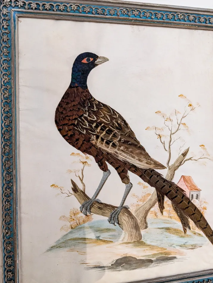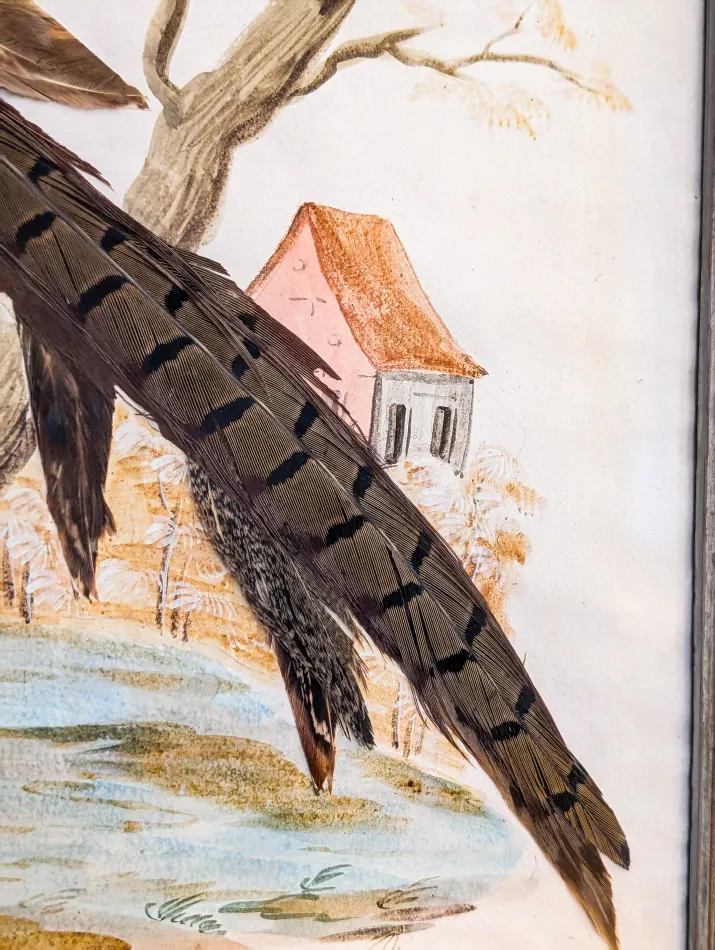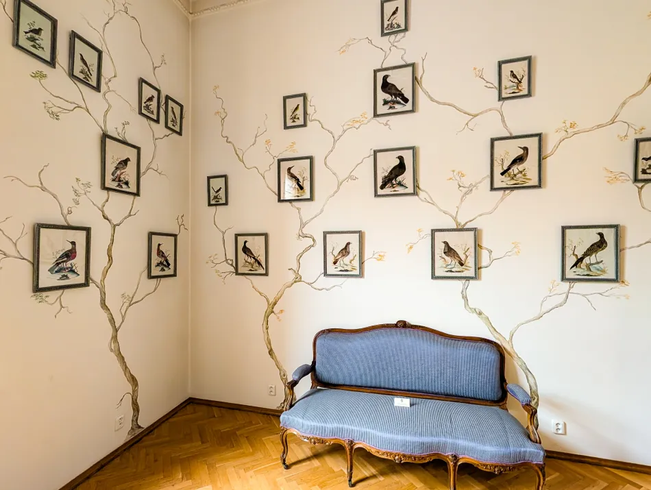 逛完上述區域後,再順著動線前進就回到偏向生活區域的展間,有一間超特別,牆上懸掛超多「看似」飛禽繪畫的藝術品,近看可以發現本體都是用飛禽羽毛組成,再搭配背景的繪畫,很神奇!也有展間陳列一些打獵或與狗相關的藝術品,但我覺得比較普通、就不特別介紹了。