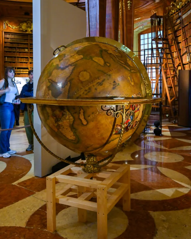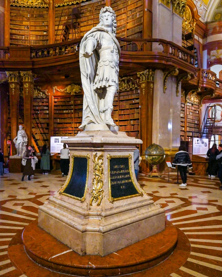 奧地利國家圖書館的工程是始自於查理六世執政期間,國家大廳也是他在位時落成的,在建築最顯眼的區域陳列他的雕像非常順理成章,不過…這是在落成近10年後才完成的!這邊是國家大廳的中樞,周遭還有擺放不少權貴或者學者的雕像,以及由威尼斯知名工匠製作的地球,其中一個還是瑪麗亞.特蕾莎的丈夫帶回來的。