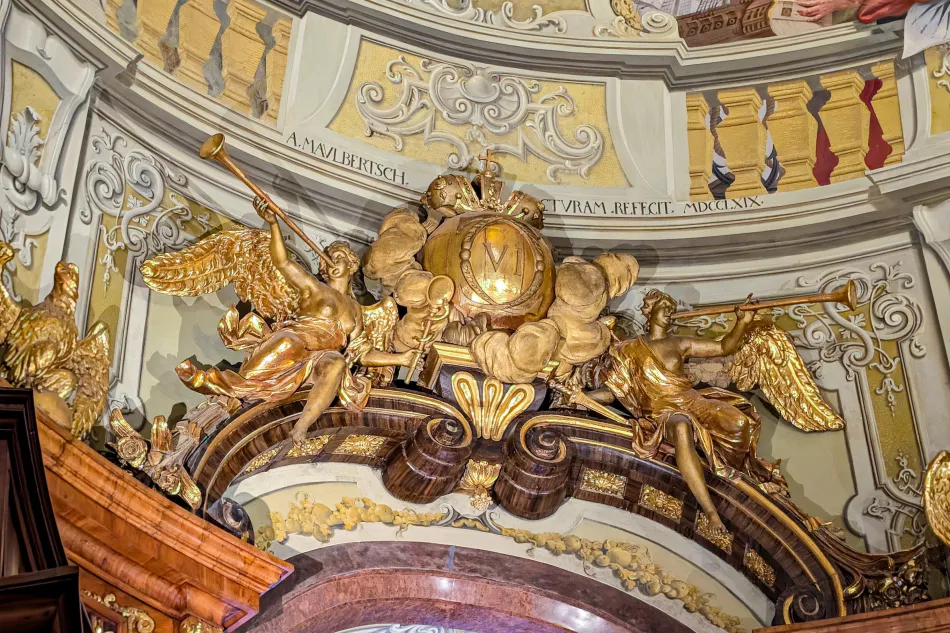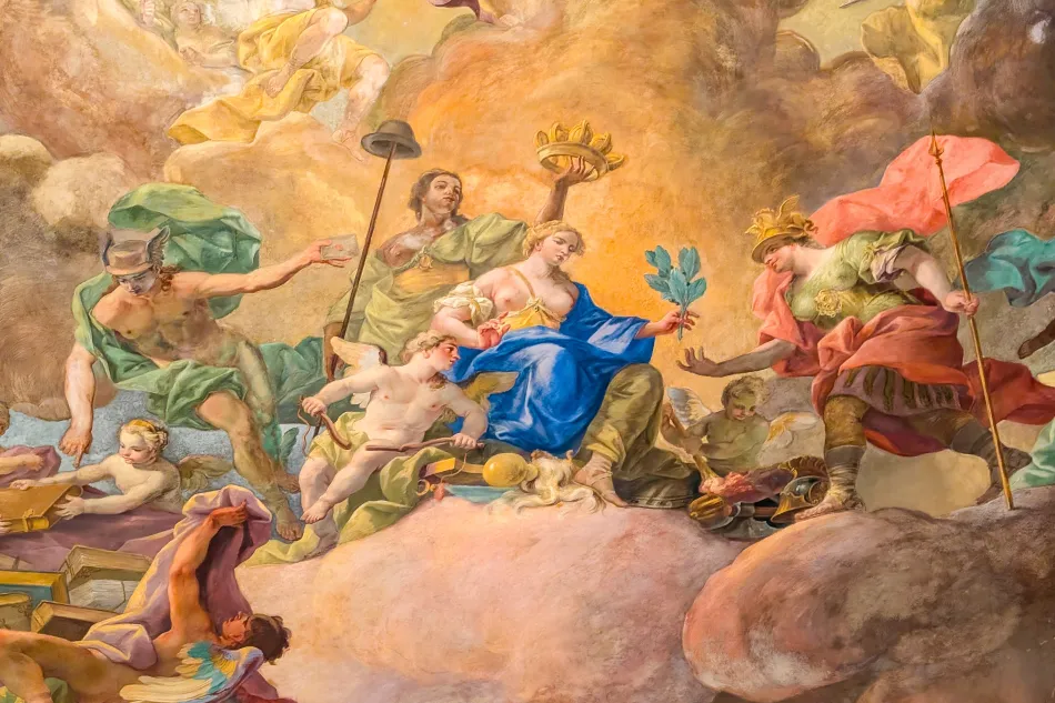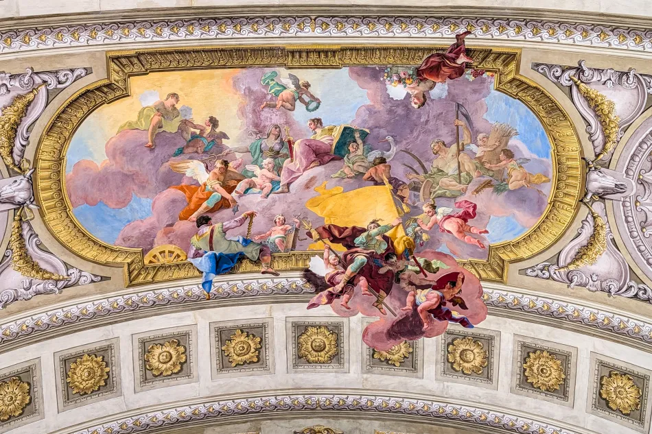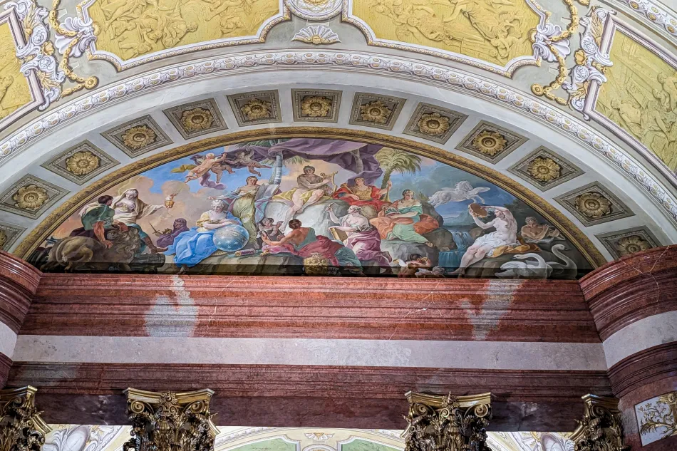 這邊的天頂壁畫也很精采,不過…太高了、很難欣賞,總之就是以希臘神話搭配各種皇帝的象徵,來歌詠哈布斯堡王朝的豐功偉業。