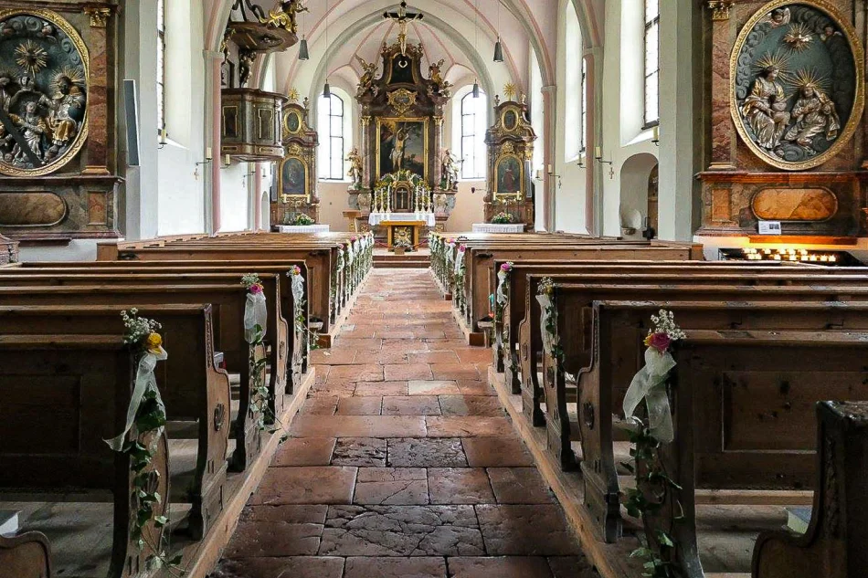 下公車後第一件事當然就是近距離拍攝詩情畫意的藍紹教堂(Pfarrkirche St. Sebastian),當然不如在河畔拍的好看。這教堂的內部沒特別之處,就是典型的小鎮教堂,我會進去是因為跟旅伴要躲雨,時間比較趕的人可以跳過!